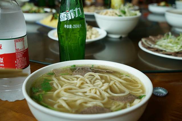 不知不觉已经到了中午饭点,俗话说的好:上车饺子下车面,来齐齐哈尔的第一餐,就是这家有着将近三十年历史的【十二忠手拉面】,好多食客为了这一碗正宗的拉面坐高铁专程来吃,可见它的美味之极。面条的宽细可以根据个人喜好选择,汤底清亮飘着些许的油花,味道醇厚浓郁,鲜香至极。搭配着特色小菜,干拌豆腐丝,酱牛肉,齐齐哈尔特色汽水“雪菲力”绝美搭配。