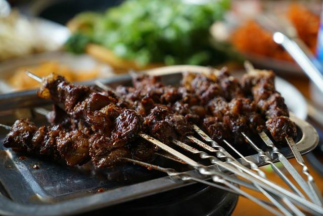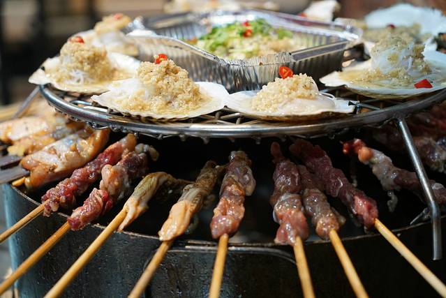 吃了炭火烤肉,电炉烤肉,今天来点不一样的。今天的晚饭就在【大竹签烤肉】解决了,大竹签烤肉算是齐齐哈尔烤肉的另一种典型代表。门口如一只大刺猬般的竹签扎在一起如此壮观。将近一臂长的竹签,摆满全桌,犹如一只巨型蜘蛛趴在桌上。架子上的茄子已经烤得滋滋作响,旁边摆满扇贝和生蚝,旺盛的炭火让肉串瞬间成熟,裹满干料放入口中,那么长的竹签,小心扎到隔壁老王哦。吃齐齐哈尔烤肉必须配上冰爽雪菲力,两瓶起的~