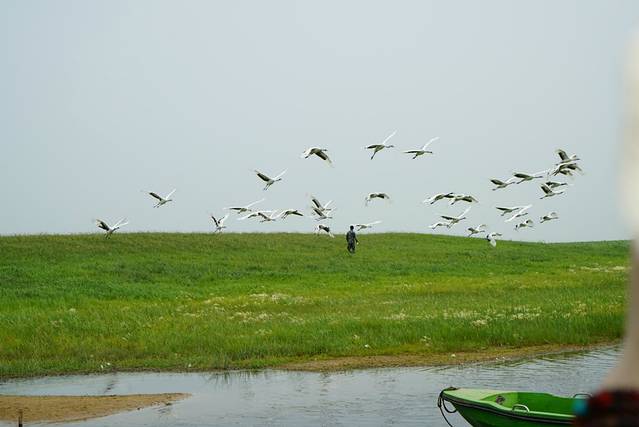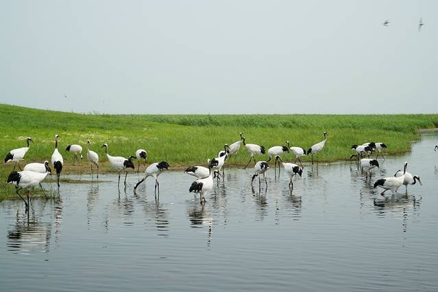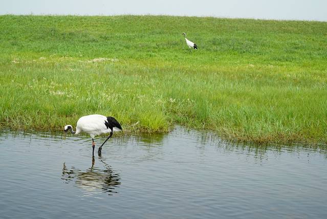 穿梭于浓密的芦苇荡中,顶着烈日,只为一睹丹顶鹤的风采。这里以观赏珍禽丹顶鹤最为著名,有着世界四分之一数量的丹顶鹤,每天四次放飞丹顶鹤的时间:上午9:30,11:00,下午14:00,15:30.可以合理安排游园的时间。必须不可错过的一场震撼心灵的景观。放飞时间到,随着工作人员红旗招展一声令下,二十几只丹顶鹤从山坡那头陆续飞出,我还沉浸在壮观宏伟那一刻的时候,鹤群已经轻轻从我头顶飞过,内心的激动必须要身在鹤群中才能体会的到。飞过一圈站在湖泊中或群或单,静静地欣赏丹顶鹤的美妙。