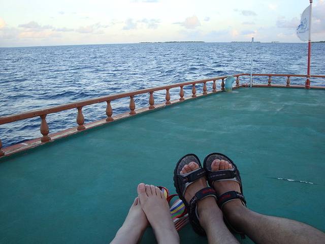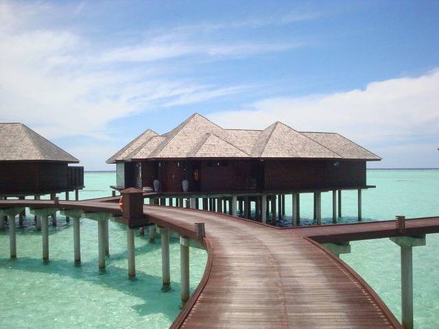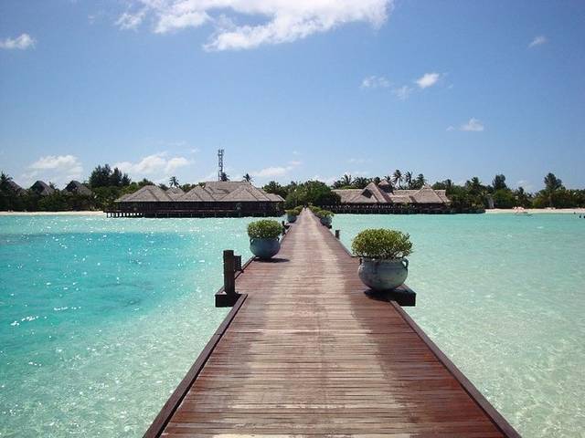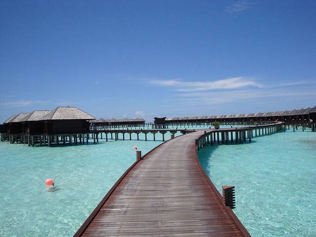 码头建在深浅交界的地方,这里是浮潜的最佳场所,在深浅交界的地方会看到很多鱼群。码头上的房子是浮潜学校,可以教你学习浮潜和组织潜水活动,可以租借浮潜和潜水设备。沿着码头向岛上走去,感觉马尔代夫的气候还是很舒适的,没有深圳上海杭州那么闷热潮湿,反倒有些像中国北方那样紫外线照射很厉害空气干燥,当有风吹拂的时候还是很凉爽的。码头通往岛上的栈道两边都是淡青色的海水,大概只有半米多深,清可见底,偶尔还可以看到三三两两的鱼儿悠闲地游过。双鱼岛就横躺在我们面前。