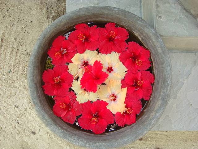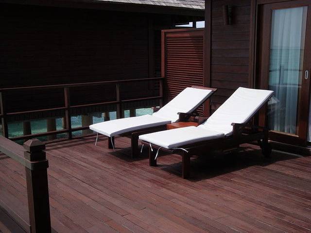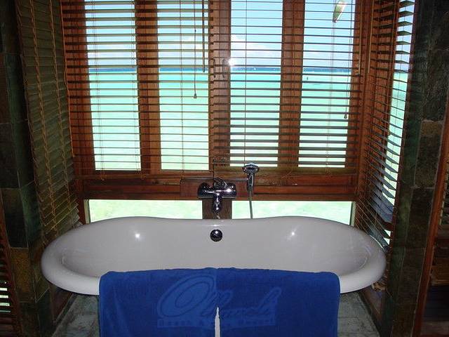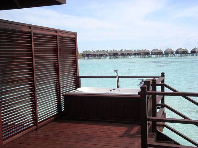 水上屋的装修很豪华,超大舒适的双人蜜月大床,独立宽敞的卫生间和沐浴间,两套独立的洗脸台,屋内屋外各有一套按摩浴缸,在充分享受按摩的舒适的同时,还可以看到真正无敌的海景,阳台上有两张躺椅,顺着台阶从房间就可以直接下水。正是由于如此方便的设施,所以我们频繁地下水才让我这个不会游泳的旱鸭子学会了浮潜。想象一下边洗澡边看海的感觉