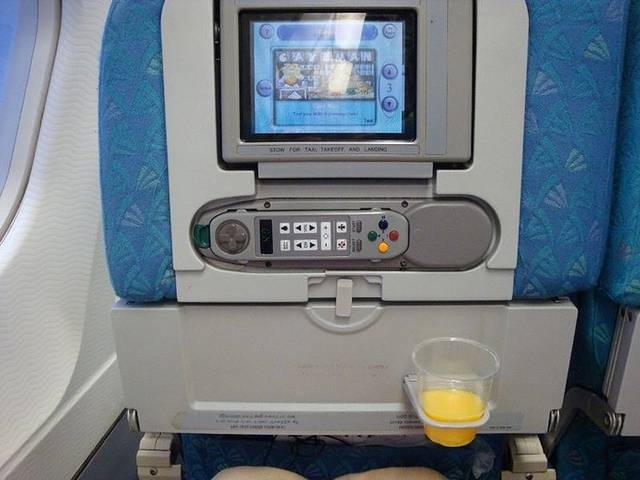 飞机座位的背部内嵌了显示屏幕,可以听音乐看电影打电话,还可以玩游戏,俄罗斯方块、贪吃蛇、飞行射击游戏等等。回来的飞机上重温了一遍近期的电影《钢铁侠》。