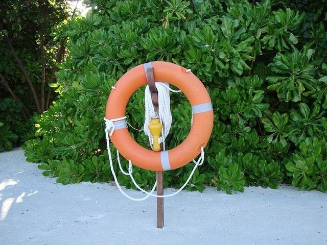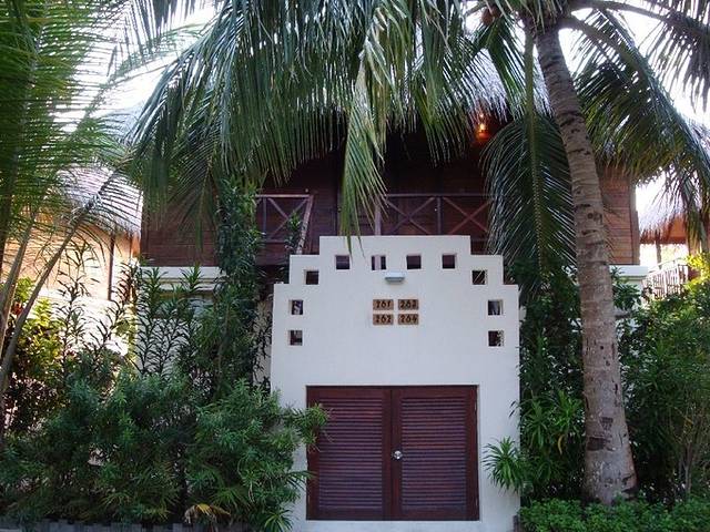 豪华客房面对的沙滩上有木材和茅草搭乘的十几个凉棚,方便游泳和休息。对面还有一片无人的沙洲,沙滩每隔一段就有绑在木棍上的救生圈供随意使用。这边的海水相对于码头和水上房那边有些深,从空中俯视照片的海水颜色也可以看出来