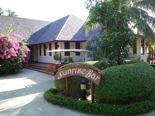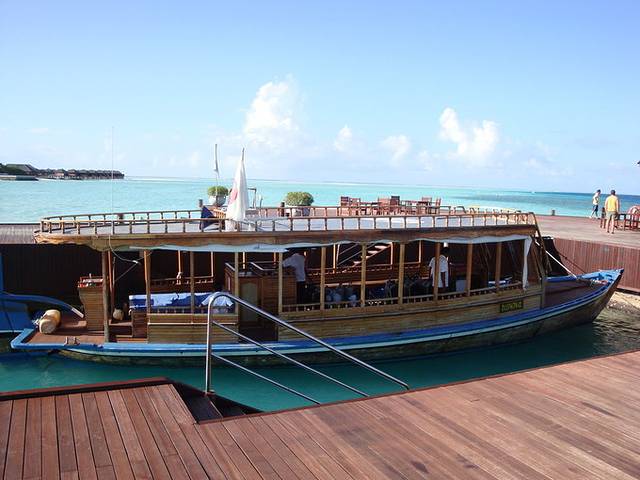 岛上共有3个餐厅,作为主要吃饭地点的Sunset餐厅,还有吃蜜月晚餐的餐厅,就在码头Sunset餐厅对面酒吧的后面。每对情侣都可以免费将一顿晚餐升级为蜜月晚餐,属于比较正规的西餐,味道还可以,但是情调绝对一流,当你坐在海边的餐桌上点着烛光吃着美味的牛排,海水在你下面轻柔地拍打沙滩,天上的月色很朦胧,银河系非常清亮地铺在夜空上,你或许会对这段话有更深刻的理解。还有个酒吧在极可意和蜜月水上房那边,主要是吃日式的饭菜,我们没有去过。酒吧有三个,比较热闹的是靠近码头这边和Sunset餐厅相对的Lagoon酒吧(名字有些记不清),每晚都有个主题,还记得周四是中国歌曲。还记得那天晚餐时听到隔壁酒吧飘来的萧亚轩的《最熟悉的陌生人》。还有个酒吧位于无边界泳池附近,另外一个在去豪华客房的路上,服务中心过去一点就是。