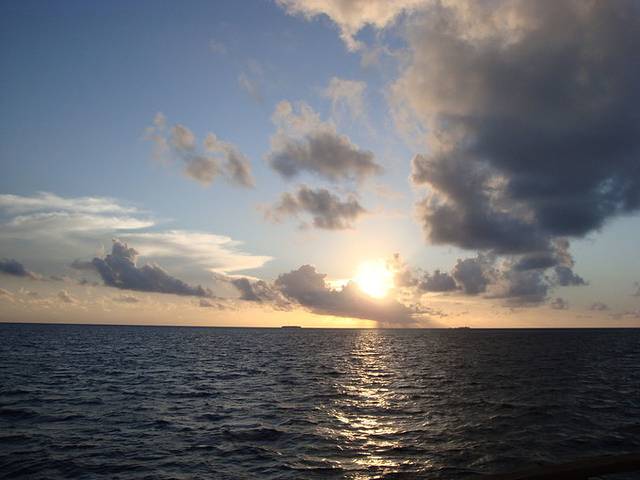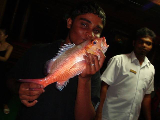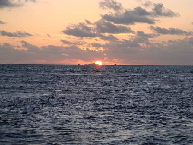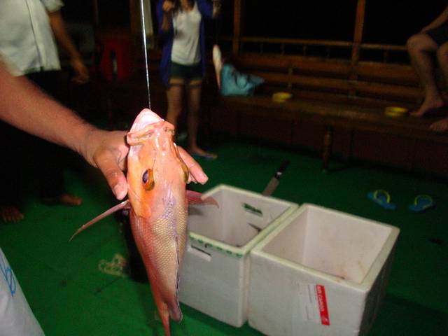 日落钓鱼是采用非常简单的工具,用塑料圆盘卷鱼线,拴上鱼钩和铅坠,用鱼肉挂在钩上钓肉食鱼。我们咨询了服务生,他们说需要把鱼钩一直放到海底,然后把线收紧。一手拿着线盘,一手拖着绷紧的线,当鱼儿咬钩时手会感觉到,猛地提钩就可以有所斩获。开始大家似乎都感觉到鱼儿咬钩,我自己也感觉被鱼咬了几次,但是提起来又没感觉了。慢慢地大家都开始有所收获,我几次强烈地感觉到鱼咬钩,但是提起来要么空空的,要么就挂到水底珊瑚上,鱼饵却不知所终了,估计被狡猾的鱼给吃掉了。终于当我再次感觉到鱼咬钩的时候,我沉住气地耐性等待,等感觉它这次咬的非常凶狠的时候才猛地提起,收线时沉甸甸的感觉让我非常地兴奋,心里知道这次有门。在快到水面的时候,感觉非常重,几乎拉不动,甚至怀疑是不是又挂到什么东西了,最终似乎它终于无力抵抗了,俺兴奋地把它拖到船上,它是当天钓到第二大的鱼,第二天成为我们晚餐上的亮丽风景了。最大的鱼也是咱们中国人钓的,最后只有几个老外没钓到!此前在水库池塘钓过几年鱼,这次是首次在海里钓鱼,那种开心和高兴无以形容。