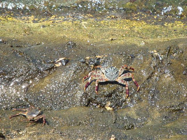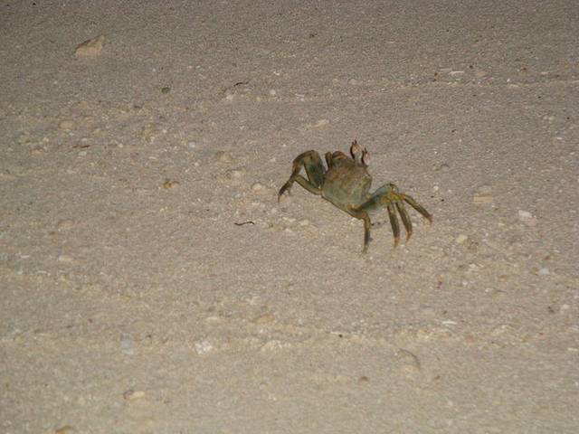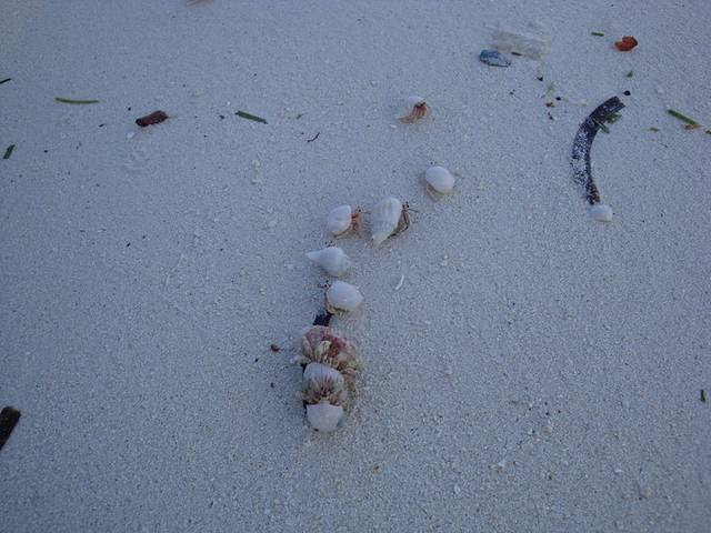 在沙滩上经常可以看到很多拖着贝壳行走的寄居蟹,如果是清早还会看到他们的集体行军!清早拍摄的照片,光线有些暗淡!你会奇怪地发现沙滩上有很多非常规整的圆形竖直的洞穴,到底是谁干的呢?经过清早耐性的潜伏,终于让我找到了真凶。但是白天这些螃蟹很鬼的,从来不轻易到沙滩上来,即便在码头那里,他们也躲在安全的岩石峭壁上,瞪着两个凶狠狠的大眼睛,任凭狂风巨浪冲刷。晚上带上头灯,两个人提心吊胆地跑到沙滩上,海风呼呼地吹着,只有海浪哗啦啦的声音,夜空下的沙滩黑乎乎一片,但这确是螃蟹出来活动的时间。看看我们都发现了什么。