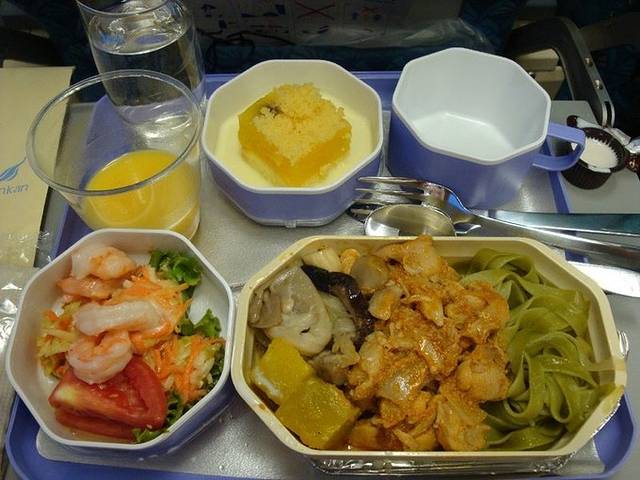 飞机上的食物还是蛮可口的,我们在预定机票的时候选择了东方口味和海鲜口味。如果不特别指定,基本就是类似国内航班的那种鸡肉饭猪肉饭。特别值得称道的是蛋糕,每次口味都有所不同,最喜欢的是第二天早晨从斯里兰卡到马累航班早餐的面包,刚刚烘烤出来热乎乎地,配上黄油,实在回味无穷。