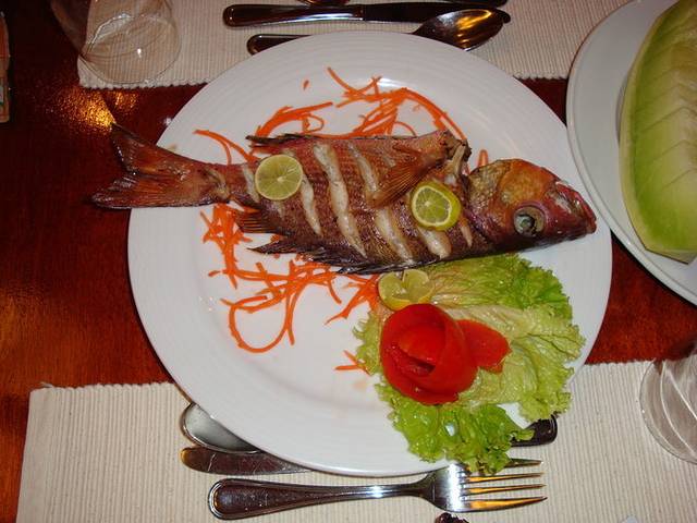 日落钓鱼可以看到日落的风景,还可以欣赏银河繁星和月亮,安静地享受印度洋海浪的声音,更是有机会亲手钓到不知道名字从未见过的鱼。我到现在还无法忘记坐在船边,握着鱼线看星星的感觉,那是一种非常美妙地说不出来的感觉。如果你要参加这个活动,记住不要在最后一天参加,否则你将无法在第二天晚饭品味到下面这个自己亲手钓的鱼做成的美味(西式做法味道不习惯看起来挺漂亮)。