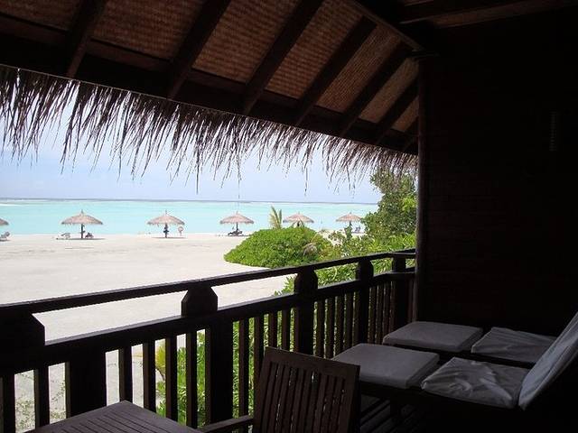 上岛后收到了工作人员的热情迎接,在酒吧里服务员端上冰凉的果汁,让我们填写入住的信息,包括个人信息和离开时间和航班,便于他们做相应的安排。随后由服务员引导我们去个各自的房间,大件行李他们会后续送过来不用自己提的。我们预定的是豪华客房,是那种二层独立的小楼房其中的一间,我们是在二楼。房间主要就是卧室、洗手间、阳台和过道。卧室中间放着双人的大床,因为我们提前说明我们是蜜月旅游,让他们提供蜜月服务,所以床上用鲜花和草叶铺成了Happy honey moon的字样,同时奉上新鲜的蜜月水果篮。非常值得称道的就是阳台是面向岛另外一侧的海滩,浅蓝的海水边上有十几个草厅,很多人在那里晒太阳过着悠哉悠哉的日子。阳台上有舒服的躺椅可以休闲,在室内躺在舒服的双人大床上就可以看到马尔代夫的海,那种感觉恐怕很难用语言描述。