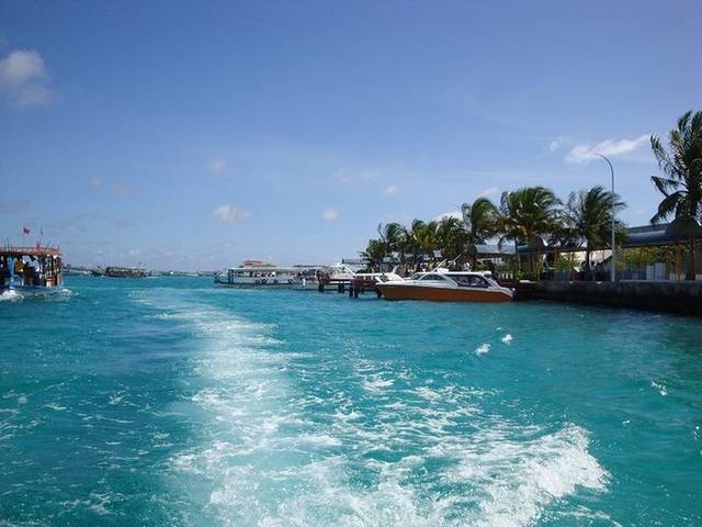 我们选择来回都在斯里兰卡住一晚,去的时候可以选择凌晨上岛,但是感觉半夜看不到快艇路过的沿途景色,而且白白浪费岛上一晚的住宿费用(好几千块呢);回来则是没得选择,必须在机场过夜。当我们第二天抵达马累机场时,太阳才刚刚升起不久。 出机场后,两边都是各个岛屿的接待柜台,找到双鱼岛的柜台后,得知还需要等待两位游客,于是在旁边休息,大概半个多小时后才任满上岛。同船的都是欧美的白种人,年龄有老有小,都是成对来度假的。