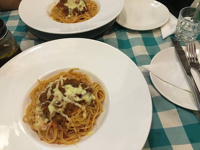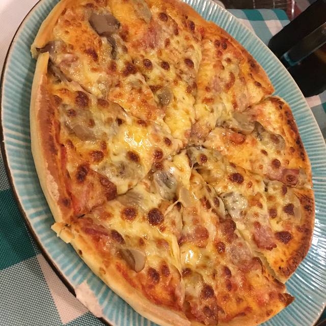 吃了两顿啤酒鱼之后我们决定换个口味吃点西餐 于是寻觅到了拐角处的这家叫{比萨小厨}的西餐厅 四个人点了两个披萨两份意面 价格接近两百 味道不错