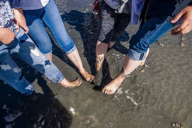 先下到湖中去拍照,脚下踩的盐壳是滑腻腻的,而且有些粗盐粒很硌脚。