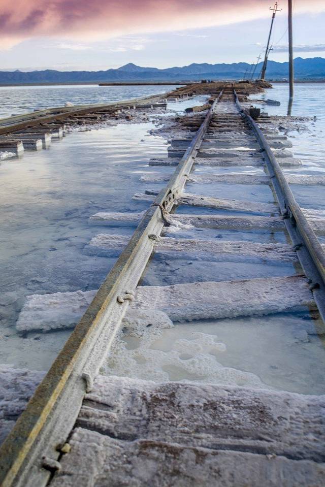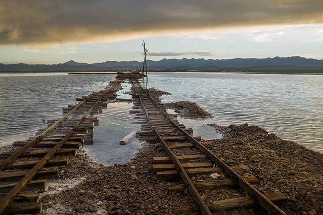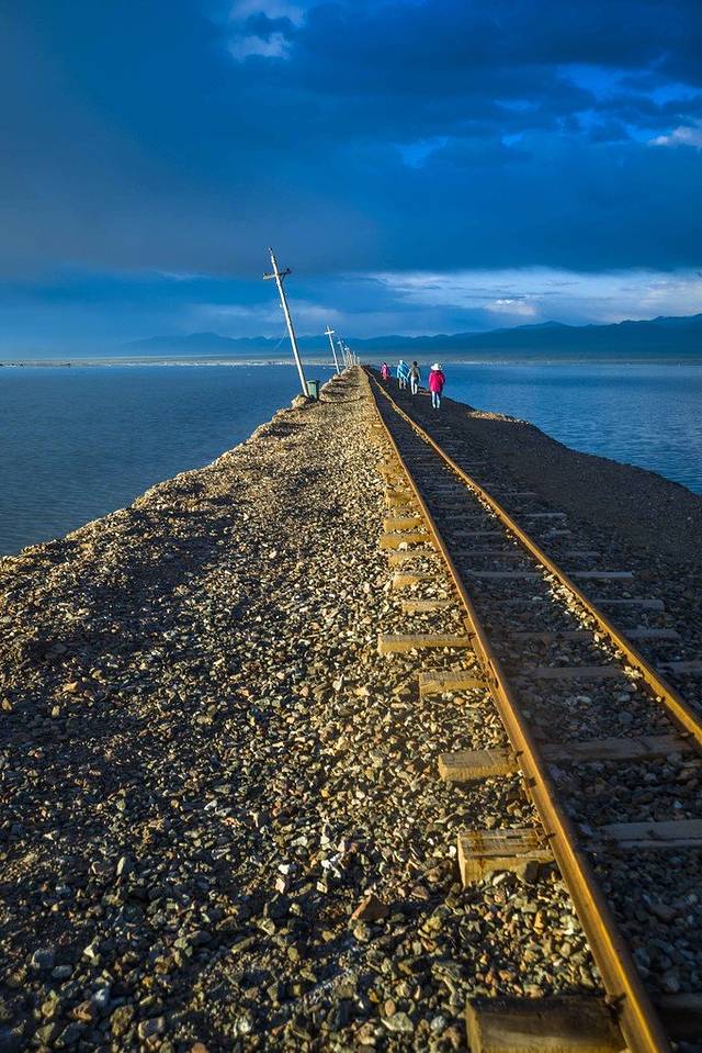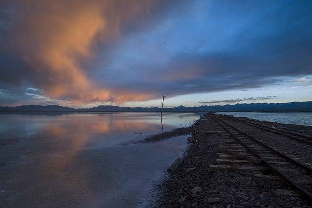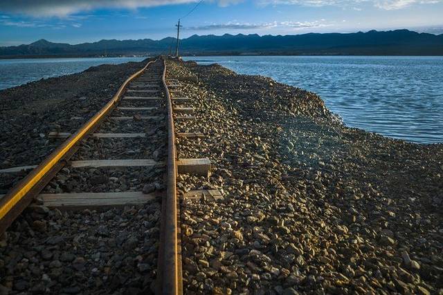 沿着铁轨一个人向着湖中心走去,有些地方的路基已经被湖水淹掉,只能小心的踩着枕木淌过去。整整一个小时,走到了湖中心。周围空无一人,异常安静。裹着睡袋在寒风中等啊等,终于等到了太阳升起前,霞光照红天空云层,又映红湖水的壮丽景色。