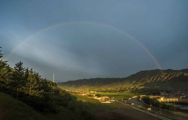 东边阳光照亮金塔的美景没有等到,西边天空等来了一道完整的彩虹。