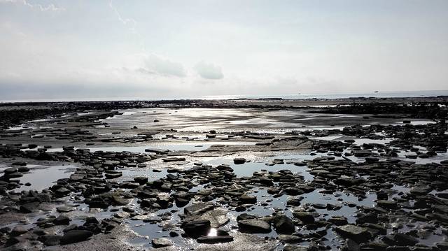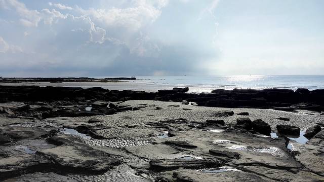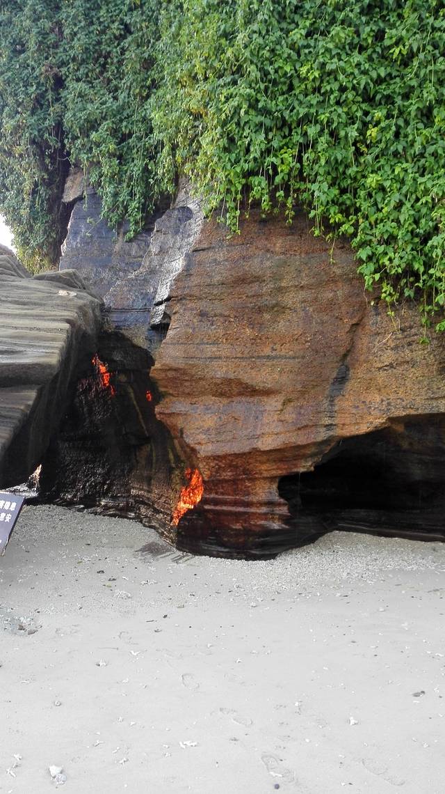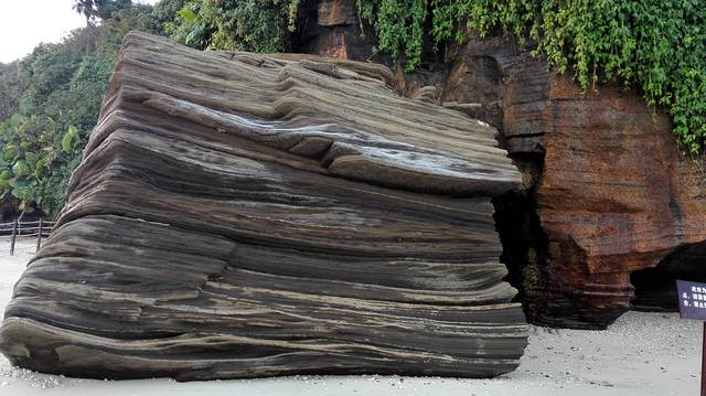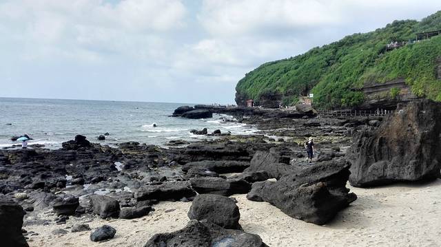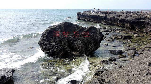五彩滩:原名芝麻滩,是因沙滩上有许多像芝麻一样的黑色的小石粒而出名。退潮后的芝麻滩格外的漂亮,巨大的火山岩石一层一层的,在阳光的照射下特别的壮面。大片大片的火山熔岩裸露出来,特别的宽阔。许多地方虽然海水退了,但还是留下了大片大片的一洼一洼的水,在蓝天的映射下,一洼一洼的水在视线中也变成了蓝色,和裸露的岩石一起,很是迷人。远处蓝蓝的天和蓝蓝的海水成了一色,白白的云点缀蓝蓝的天,让天空更生动;海水时而很温柔地亲吻着火山岩石,时而遇到岩石便跳跃起来,飞溅成白色的美丽的浪花。