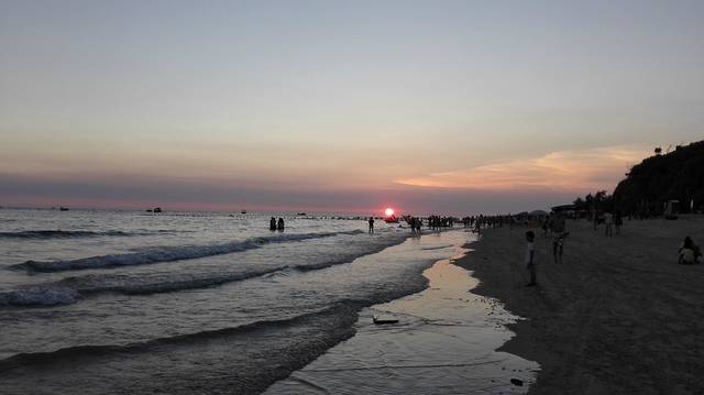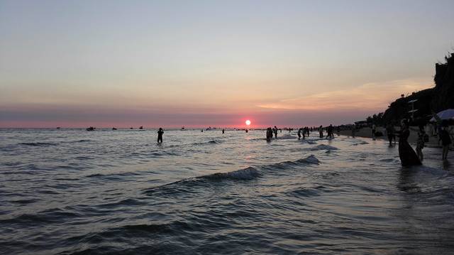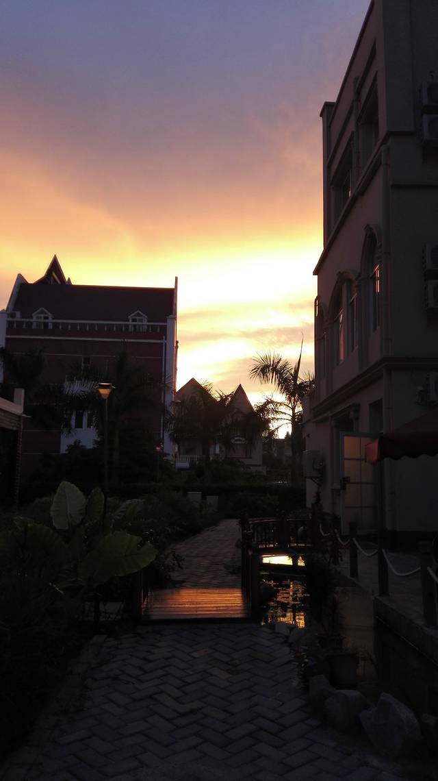 从石螺口出来,去海鲜市场买了海鲜,交给饭店,走10分钟就到了。海上的夕阳很美,小屁孩只顾着玩水,赶上涨潮,打水仗吧!
