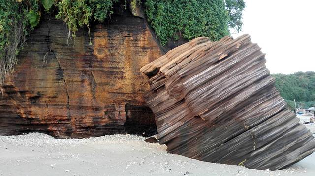 滴水丹屏离鳄鱼公园大概500米的距离,在涠洲岛滴水村南岸边,原名滴水岩。滴水丹屏的形成堪称中国火山景观的奇迹,岩石形成的悬崖峭壁,是该岛最为醒目、壮观的海蚀地貌,裸露的岩层有红、黄、紫、绿、青五色相间,纹理异常清晰,崖顶之上藤树缠绕,红花绿叶倒挂崖头,展现出旖旎多姿的色彩,取“丹屏”。令人称奇的是,巨崖岩层上长年涌动着水珠,不断地向崖下滴落,在阳光下如断线珍珠般飘洒,晶莹剔透闪着绮丽的亮光,煞是好看,所以取名“滴水”。