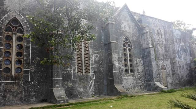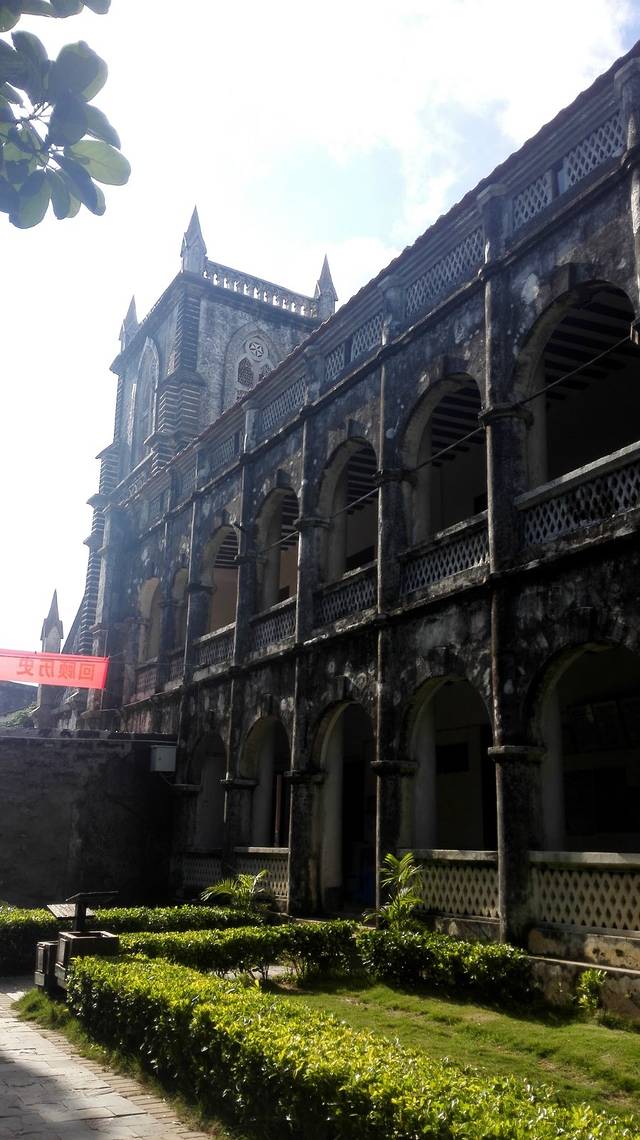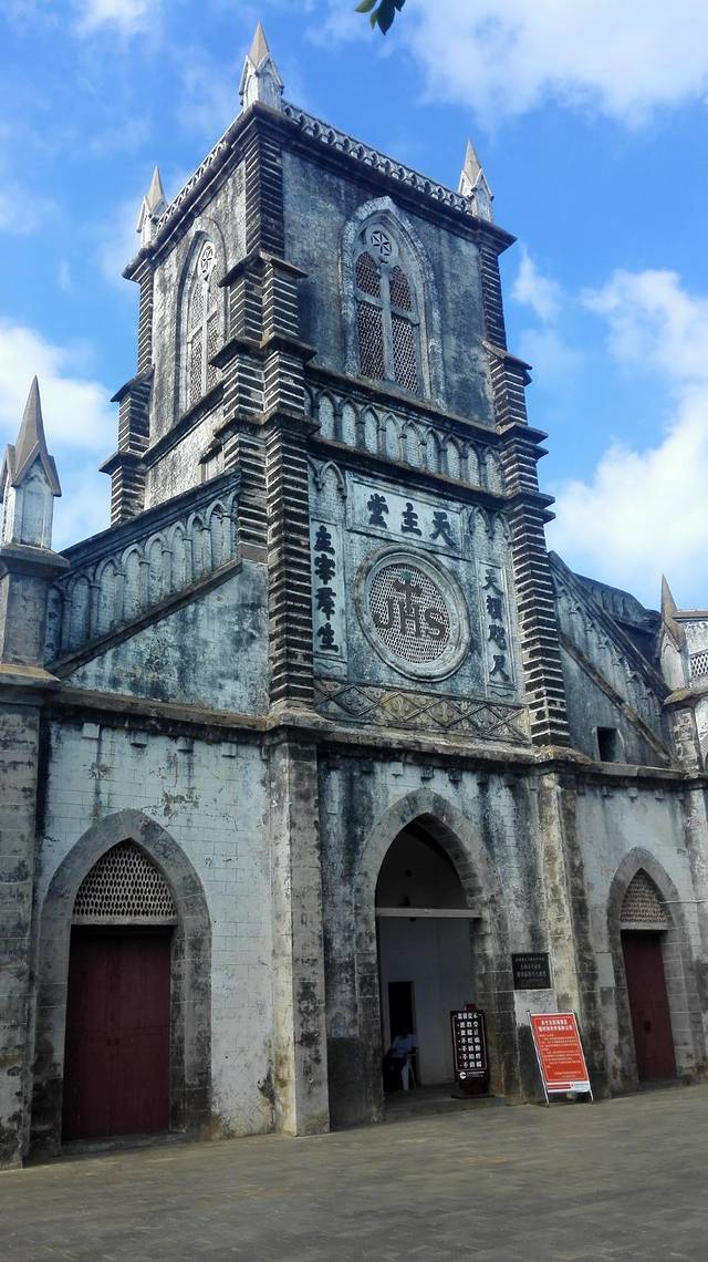 法国哥特式的天主教堂颇具特色,它高13.5米,长56米、宽17米,全用岩石、珊瑚粒及竹木瓦建造,建筑面积为1500平方米,教堂内可容纳教徒1500 人。涠洲岛天主教堂始建于清代同治年间历经20年才建成。据说此教堂为当时全国四大教堂之一。涠洲天主教堂由钟楼、修道院学堂、医院、育婴堂所组成。由于 “文革”的扫“四旧”,除教堂和钟楼外,其余都已荡然无存了。迄今仍可供教徒们在教堂内弥撒祈祷和供后人观瞻。