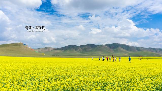 要说整个青海湖什么地方的油菜花最好看,那估计就是金银滩的了,金银滩的油菜花不想之前看到的油菜都是稀稀拉拉不成样子,这里的油菜花满眼望去一片黄,和后面的山连在一起简直就是一幅画,不过进去是要收钱的,反正在外面也能看,我们就没进去,在外面拍了几张照片~