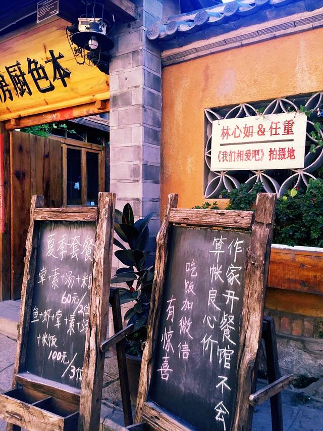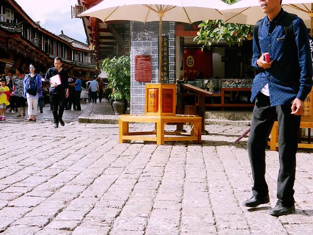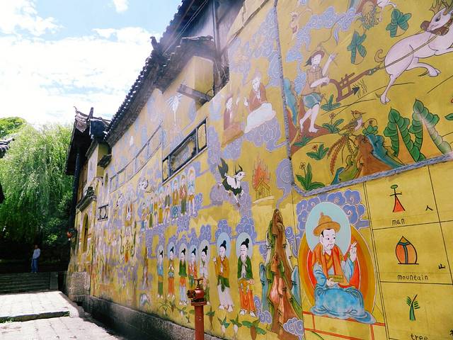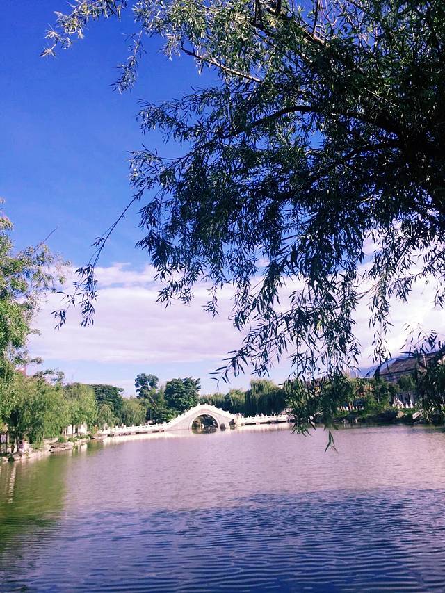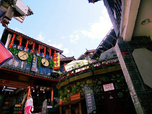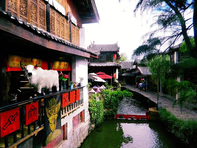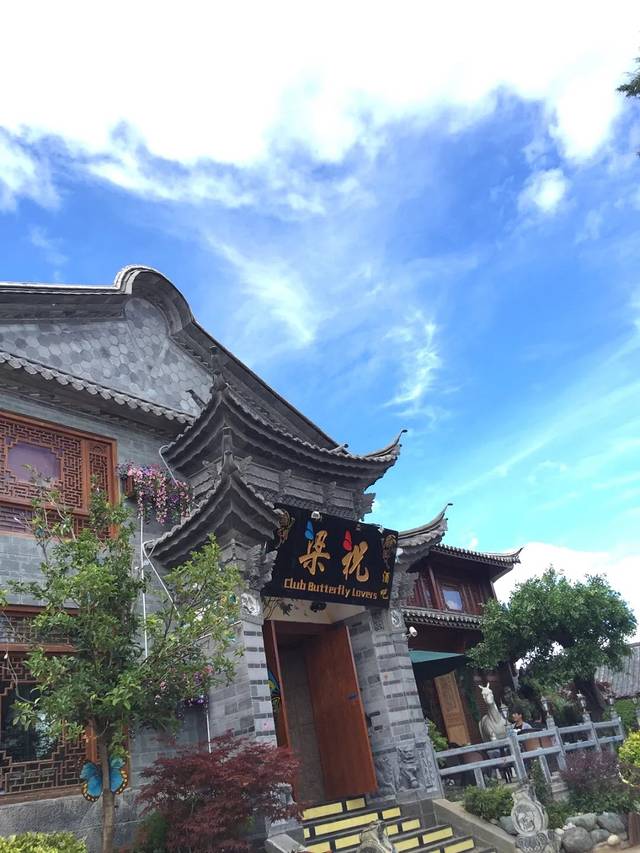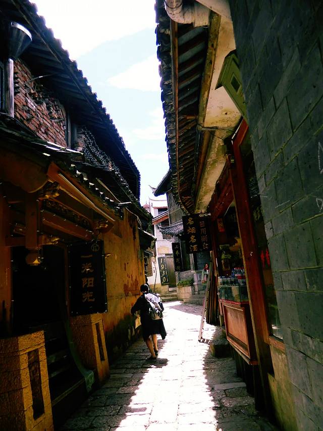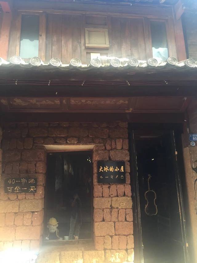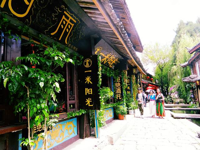 又是自然醒就到了中午,今天不逛丽江古城了。哒哒哒出门盲走吧。客栈出来就是金虹路,马路对面有个口子总是人山人海,我去看看。走不到50米,是一个很大的梁祝酒吧。可惜了,这么蓝的天空下要让人想到一个很凄美的爱情故事。再往里走就出现了古城入口检票入,这下我懂了,原来我离古城这么近。更过分的是,去了古城里面两趟都没有看到的传说中的“我在丽江等你” 就在脚下,这也许是全中国最小的一家“等你”。紧挨着隔壁就是“大冰的小屋”。其实来之前的前一天还跟朋友说起为什么这个店这么火,经常玩微博的人竟然不认识,“乖,摸摸头”出版的时候我也就喵了一眼,真的就以为又是哪个美少女or小鲜肉的作品。可能真的是好奇吧,完全没有思考就进去了,我觉得好像就是一个15平米大小的房子里面竟然虚无坐席,你们说到底有多大?而且今天特别幸运,大冰本人在,也没有关门,基本能进来小屋纯属个人造化。大冰会给你弹民谣,然后来自不同地方的人都聚集到一起谈文艺,谈流浪和远方。没坐多久,因为我也不能来一瓶风花雪月,也怕被拆穿我这个伪粉丝的面目,就离开了。平平淡淡,云淡风轻。这种忘记从哪里来,也没有人问你是谁的感觉特别nice。突然就想去束河了,一直没在计划中,一是因为远,二是因为可以想象出来的样子。打个车过去也就10 分钟左右,软妹币25.如果你选择坐公交车,就打算步行30分钟的准备。一路上可以看到丽江新城的面貌。到了才知道,比想象中更古更安静,世外桃源的feel 似乎看不到什么金钱的交易。更难得有人陪你擦肩而过。