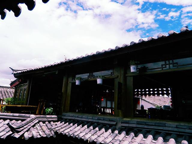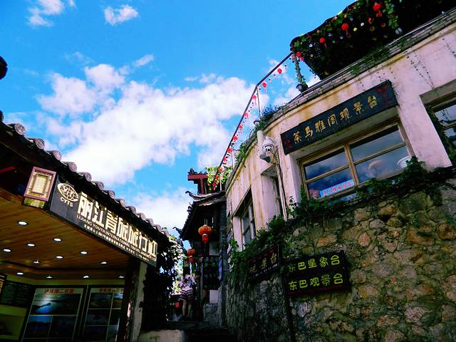 6am下的火车,在去哪儿订的接送专车。在这要提一下来的接车和预订的🚗不一样,上车我又方了,有时候也是犯罪电视看多了。一路开着导航一路看行车路线20分钟就到了目的地,随便在网上订的客栈,后面事实也证明来这边什么都可以随便不用刻意,却总会有惊喜发现。丽江日月阁客栈,五颗星推荐,在古城南口,有两个特别大的观景台可以看到古城全景。在这里做一个幸福的人。每天和蓝天白云一起早起 洗衣 做饭 浇花 座摇椅 逛古镇。楼下就是周三的情书、这家音乐餐吧是周三和来自全国不同地方90多位盆友众筹的,特别有情怀吧,可你听了周三的情书嘛?就是一个穷屌丝的对白。里面的火糖火锅看着还不错,可宝宝是一个人只好点了一杯茶和小吃。中午的阳光特别放肆,好像紫外线都暴露在空气里,白云和蓝天好像特别大胆,生怕这个城市的人不知道他们在热恋。天气预报的阵雨还是欺骗了大家。从客栈出来是金虹路,坐公交两站路,到了大研古城北门,就是有大水车的那个门啦。其实从客栈出来的金虹路有个入口,下去直接就是古城南口,这是我逛了三次古城后才知道的路线。但不论你是从哪个入口进,都一定要买个门票,官方称古城维护费。这个票一个月内有效,回来的时候看到网上竟然还有人打折出售,其实真正能一个月用上这个票的人毕竟还是少数,如果没有喜欢珍藏之类的,可以考虑贱卖给其他的小伙伴。另外提一下,虽说有的人赶在晚上进古城可以免去门票。可是如果你还在丽江还需要去其他的地方玩,再购买其他各大景点的门票同时是需要出具古城维护费的票据号的。所以,当个好市民还是没错的。
