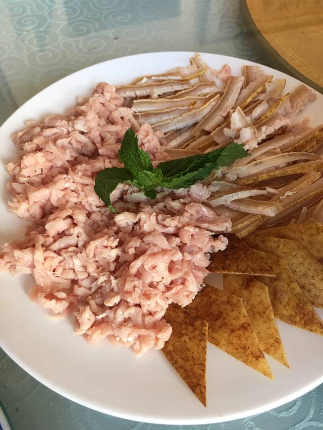 生皮:是大理白族人的特色吃法,用猪肉皮,在火上把皮烤焦,里面的猪肉是生的,沾它们的辣酱吃,适合喝酒吃,别有一番风味。
