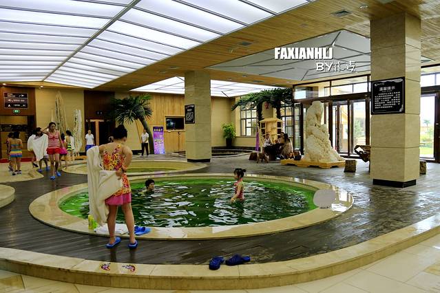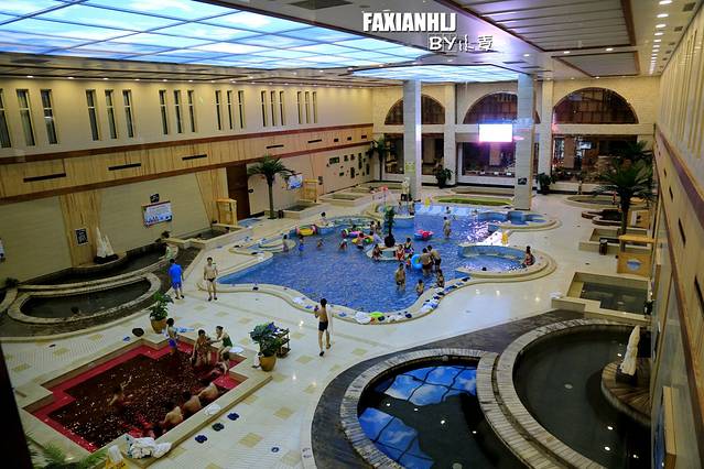 换完衣服首先来到的是室内温泉区,室内温泉区有热泉、冷泉、白酒泉、红酒池、五加皮汤、芦荟汤、亲亲鱼疗和戏水池等共24个温泉池。