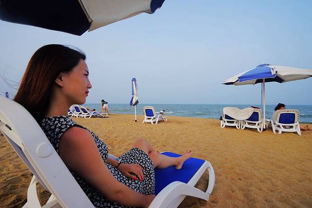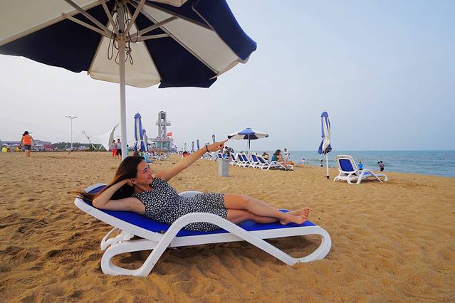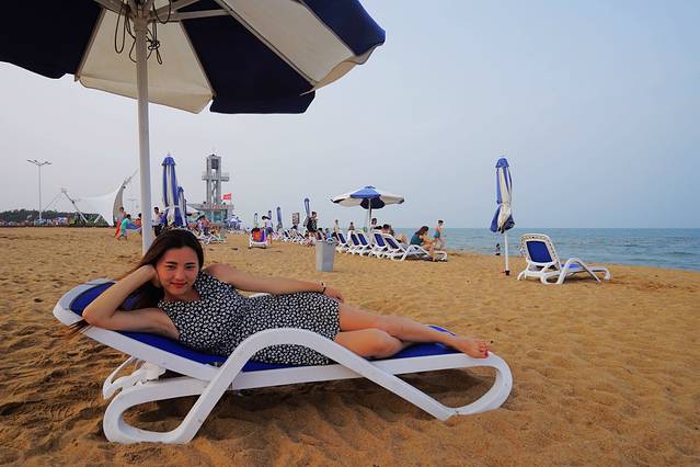 到了晚上,游客比较少了,工作人员就会把空座位的遮阳伞收起来,好像是差不多五点钟左右吧,不过也可以再打开,没有人管的。这里的傍晚比白天还要美,而且很安静,在这里静静的躺着,沐浴着海边的夕阳,听听海浪,吹吹海风,还是非常惬意的。