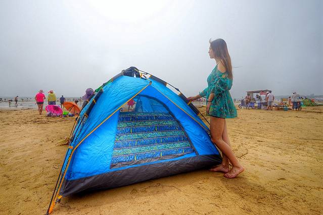 我们自己带的帐篷,很简易的沙滩帐篷,一抖就可以打开,不费力气,又可以遮阳防晒,玩累了还可以休息。在海边租帐篷挺贵的,现在是50元4个小时,旺季要100元,还是自己带合算些,用起来也方便,干净卫生。