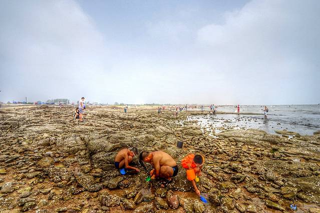 海里的礁石在涨潮时大多被海水淹没,落潮时露出海面的礁石面积可达8万平方米,礁石上布满了各种贝类和海藻,时有展翅飞翔的海鸥映入眼帘。