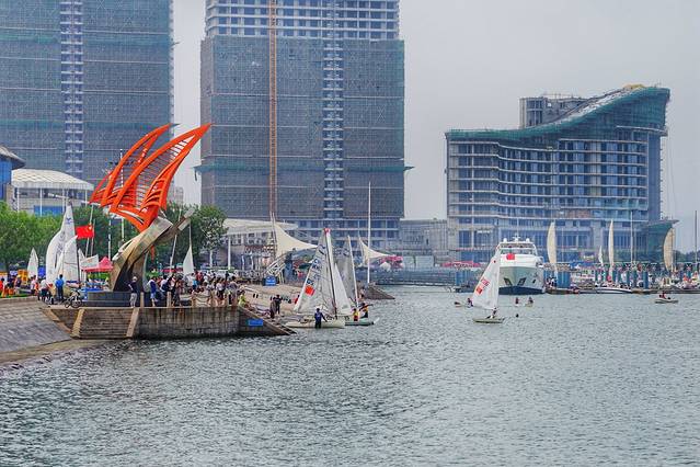 世帆赛基地火红的雕塑十分引人注目,船帆的造型也像是燃烧的火焰,让这个安静的基地充满了活力。