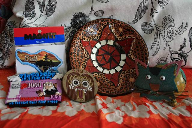 收编3个冰箱贴,巴厘岛上面的在kuta酒店超市旁买的,40000盾。新加坡的是同伴买来送我的。乌布市场买的红色彩盘50000盾。