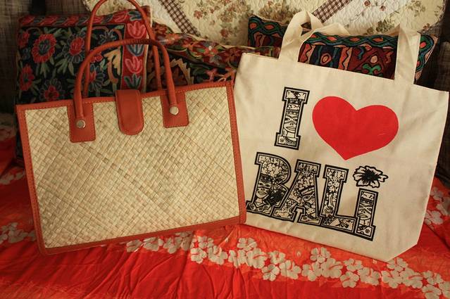 乌布市场买的手编包,底特宽,特别能装,后来逛街那几天一直在用。大小不同价格不同,我的这个较小号码,好像是70000盾。右边的我爱巴厘帆布包,带拉锁,20000盾。