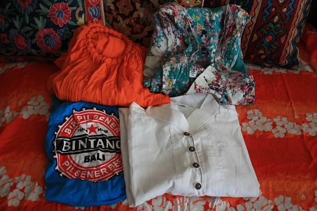 乌布市集买的海滩裙,左边橙色的70000盾;右边花的50000盾和Bintang包身裙40000盾,以及给爸爸的悠闲帅气白上衣40000盾。