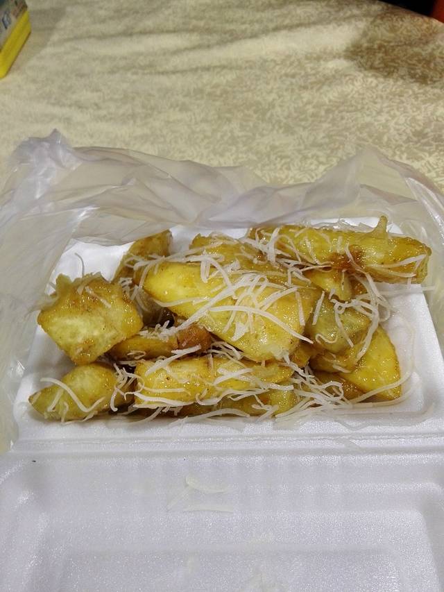 隆重介绍一下这款饭前小食,我们吃到了传说中的老板说他的全城最好吃的炸蕃薯,一口咬下去表皮的蜜糖和椰丝香浓非常好入口,里边的蕃薯才是重点,非常的柔软肉粉,值得推荐(PS:不是饭店的出品哦,是我们另外从大街上打包到饭店里吃的),好吧,填饱肚子就去找地方休息罗。。。