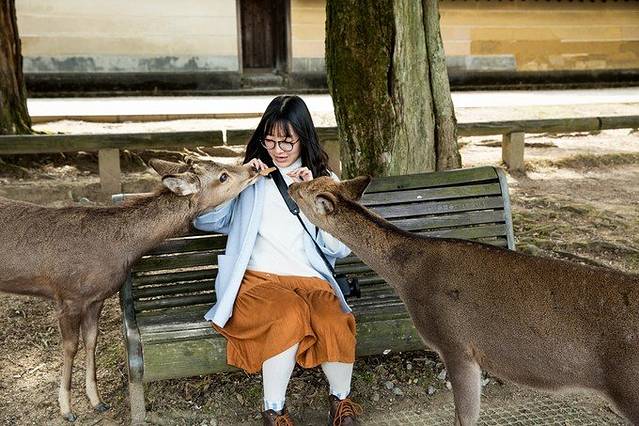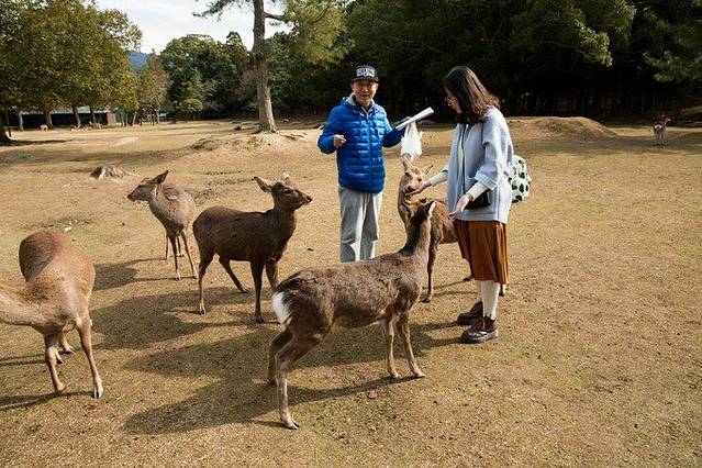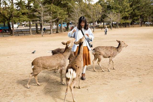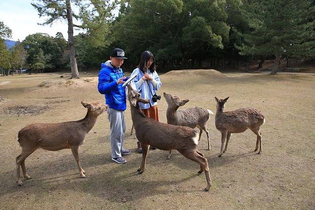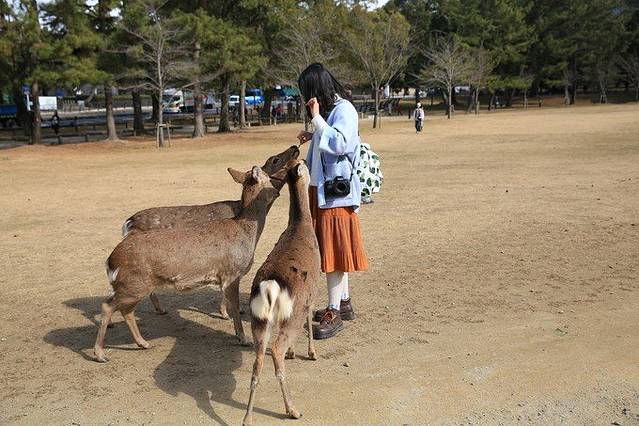 出地铁站不远就是奈良公园,面积广阔,若草山、东大寺、春日大社、国立博物馆等奈良的名胜古迹大多在这里。最为有名的是春日大社的鹿群,它们被看成是神的使者而受到人们的悉心照顾。成群嬉戏于公园里的鹿,因与春日大社流传的白鹿传说有关而受到保护,且被指定为国家的自然保护动物。