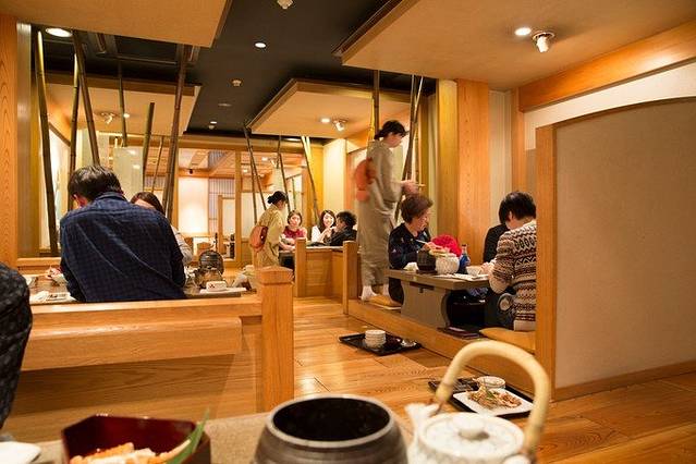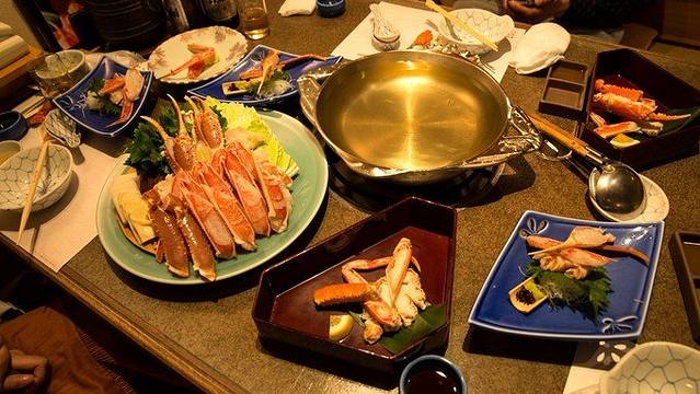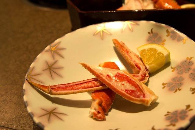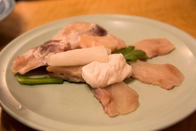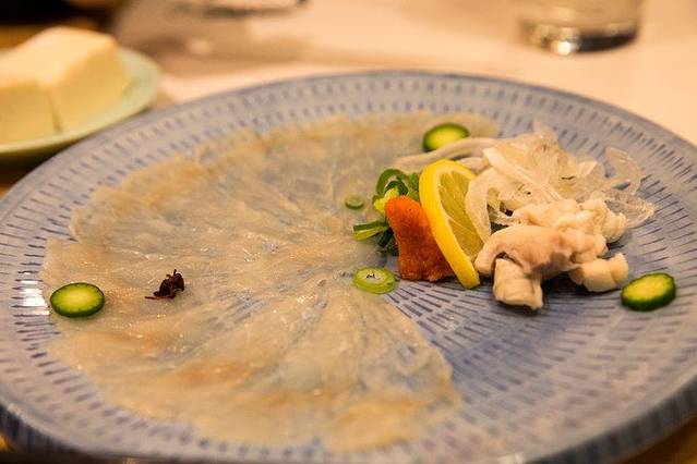 这是在大阪的一家老字号的河豚名店,人满为患。好吃的河豚刺身,但价格不菲。一个人要6000-10000日元。料理河豚和料理其它鱼类不同。河豚的肉得要薄切,透明的鱼片可以看见盘子另一边图案。日本的饮食是很在意摆放的,不光在于味道,也在于食物的美. 吃河豚鱼就要吃它本身最自然的鲜味,不在烹饪上加上人工调味, 只蘸果醋吃。