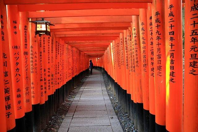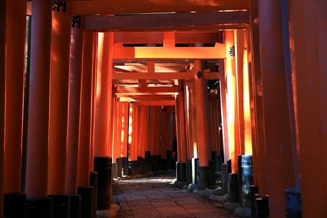 感受到的色彩,这里最出名的要数神社主殿后面密集的朱红色“千本鸟居”,是京都最具代表性的景观之一,在电影《艺伎回忆录》中也曾出现过。成百上千座的朱红色鸟居构成了一条通往稻荷山山顶的通道。