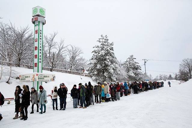 旭川动物园是日本人气最旺的动物园,位于日本北海道旭川市郊外的旭山动物园。排长队等待动物园开门。
