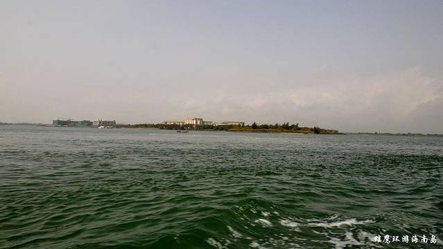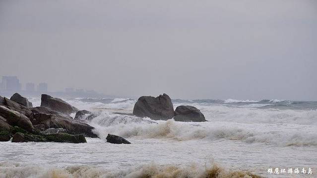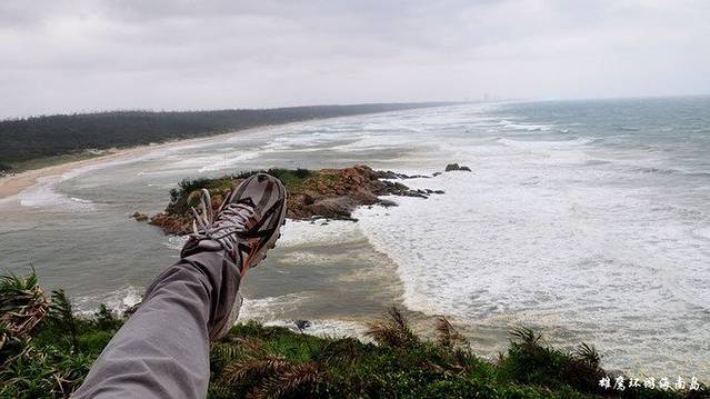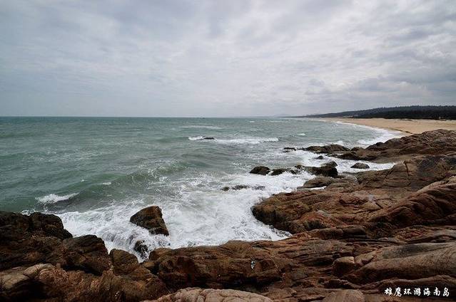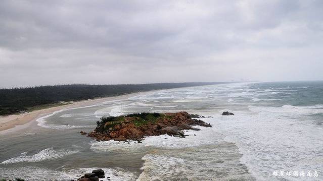 月亮湾沿着自西向东的宝陵河,绕过那些就象长在美人脸上的疤痕一样的无数养虾螗,到了宝陵河出海口就是月亮湾。我登上一个靠海的山头,从山头上俯瞰月亮湾,几十公里长蜿蜒曲折的海岸线,如同一钩明亮的弯月,南海层层叠叠的海浪如一条银白色的缎带,涟漪岸边,海中小岛、礁石好似中流砥柱迎接着海浪的拍击。可惜天气不好,我站在这里苍穹乌云密布天海之间,南海大海浪滔天,没看到美丽的月亮湾,却体会到了海啸的感觉,让人毛骨悚然。