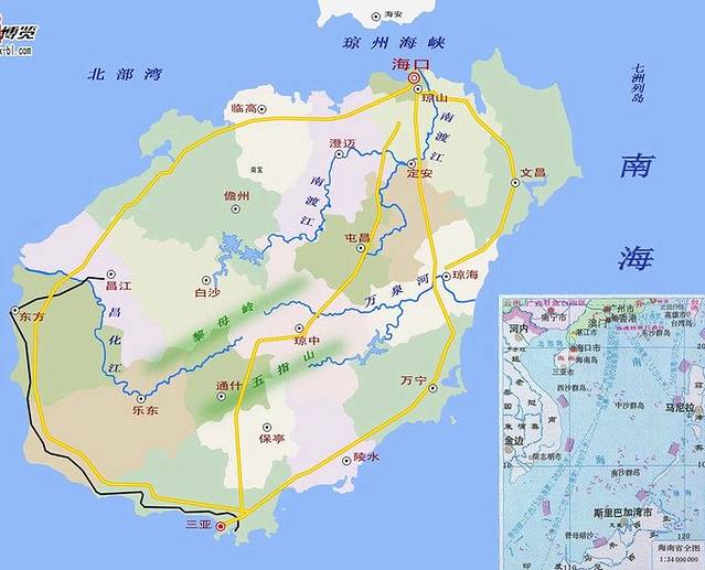 海南岛是我国最南部海南省的主岛,古又称“琼崖”、“琼州”。 海南岛四周低平,中间高耸,以五指山为隆起核心,向外围逐级下降。山地、丘陵、台地、平原构成环形层状地貌,境内的南渡江、昌化江、万泉河等都发源于这些山脉。海南岛北以琼州海峡与广东省划界,西临北部湾与越南相对,东濒南海与台湾省相望,东南和南边在南海中与菲律宾、文莱和马来西亚为邻。