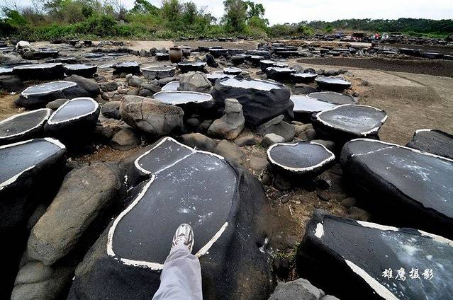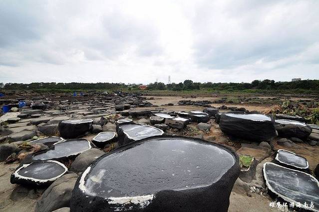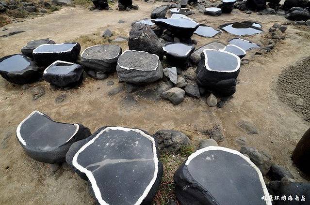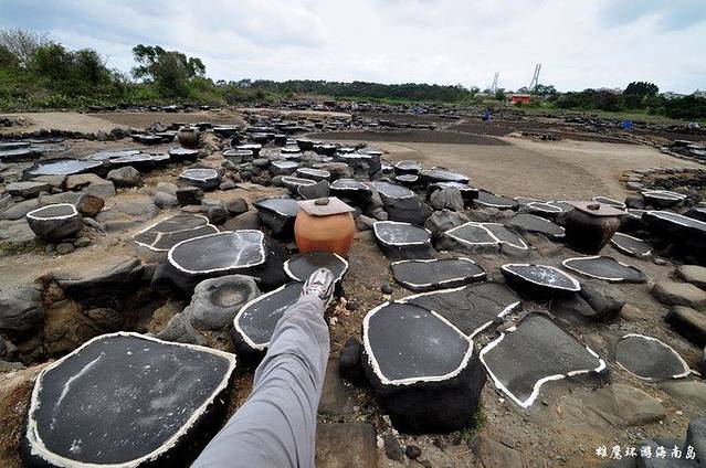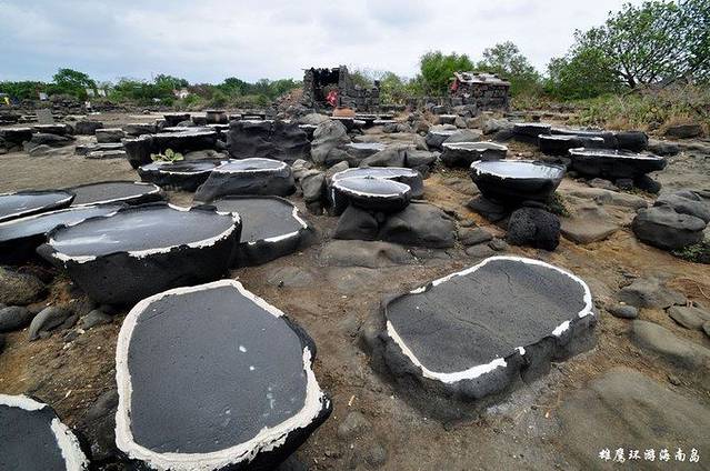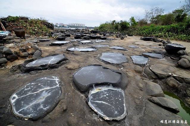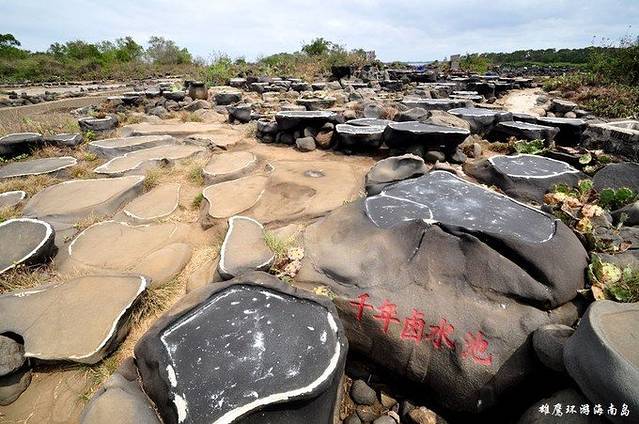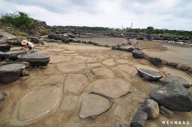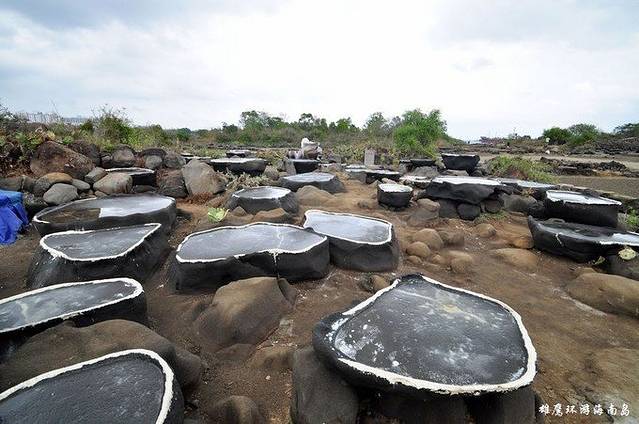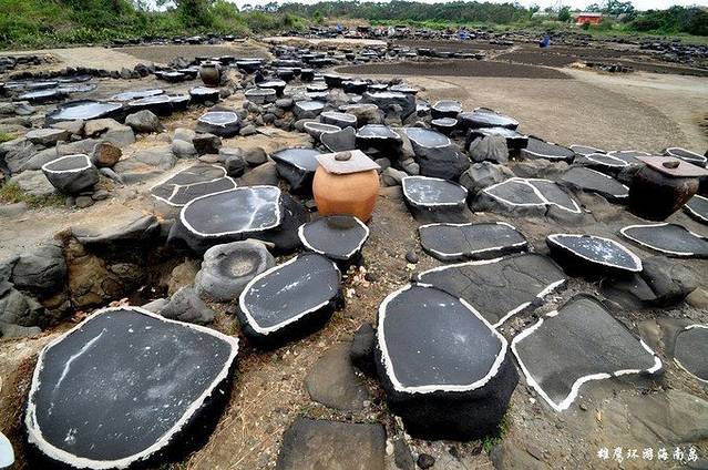 唐末年间一群福建莆田的盐工,千辛万苦迁居到当时海南岛西部的古儋耳郡,在洋浦半岛的海边开山辟石,建造家园和盐田。盐工们就地取材,将海边大片的天然火山岩石削去一半,凿成无数浅浅石槽,像一方方砚台比肩伫立,因石而异,大小、高低错落,有些上面还雕凿着古朴的文字,错落有致地分布镶嵌在一垄垄、一块块的盐田周围,昌盛时总数达6800多槽,蔚为壮观。