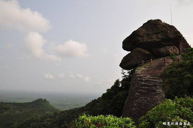 山岭顶上有一千吨巨石,颜色苍白故而得名白石岭。巨石悬于空中,令人有惊无险。从不同角度观看这块巨石,其形状各异:从高处俯视,如蹒跚之龟;从岭下仰望,似奔腾之骏马,栩栩如生。不仅以大自然的美姿迷人,尚以天籁之仙乐醉人。由山脚往上眺望,此大石像天上飞来,半块腾空,故称“飞来石”。白石岭风景区山水相映,水库星罗棋布,万泉河像一条玉带从山下蜿蜓而过。白石岭拔地而起,奇险峭立,东西南北峰,各峰景色自成一家。山上树木郁秀,佳景云集,自古以来就享有盛名。