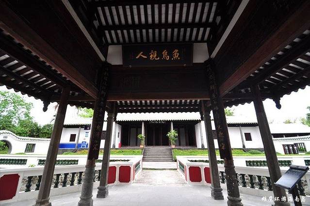 东坡书院山门悬挂的“东坡书院”黑色牌匾,是清代书法家张积的手迹。穿过山门,跨过石桥,先是载酒亭。亭分上下两层,上层四角飞檐,十二根据色的圆柱支撑起翠顶。亭中悬一块“鱼鸟亲人”横匾,意为苏东坡远谪海南岛,只有鱼鸟是他的亲人。亭内镶着以东坡与春梦婆攀谈、东坡惜别儋州百姓为内容的木刻。