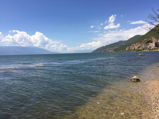 洱海边上有三三两两新婚夫妇在拍婚纱照,有骑自行车游洱海的,水很清澈。