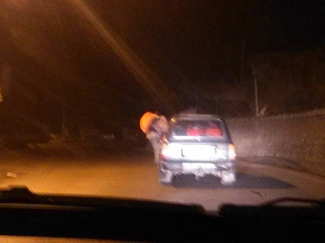 吃过早饭后,时间来到早上6点,开始从冷碛坐面包前往长海子,半路上发现一位估计是买了“挂票”的大神吧,请收下我的膝盖吧!当时看了时速表,40-50时速,牛逼!