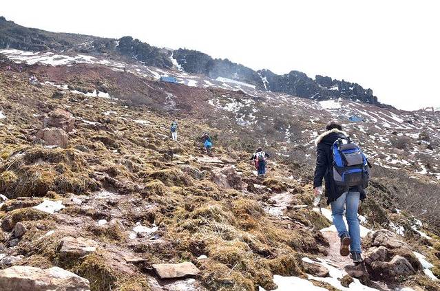 沿着小路往上爬!这时候有个登山杖真的很重要。没有登山杖的,在长海子那里会有木杖卖,五块钱一根。