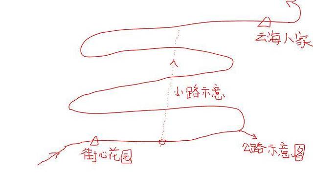 从街心花园开始,继续往上,可以选择走公路和走小路,如下面的示意图所示。走公路虽然不需要爬坡,但是路程比较长,耗时间也长。走小路是爬坡过程,基本是横切整个盘山公路,据我所见,绝大多数徒步都是走小路上去的。从街心花园大概经过2-3小时的小路,下一站就到达云海人家(云海人家也是中途的一个补给站和小卖部),它附近也开始有了其他的一些小卖部。整个路线,也就只有街心花园和云海人家这两个可以补给的地方。
