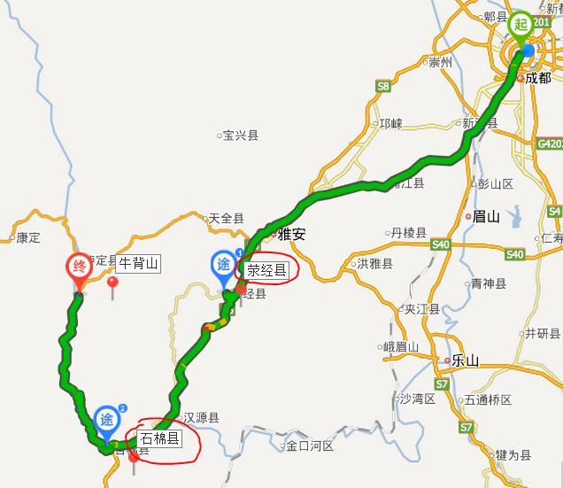 由于牛背山还没有被开发,没有直达的往返班车,自己为了省去交通和住宿等方面的麻烦,于是拼了某团,4月1号(周五)晚上7点,旅游大巴,从成都出发,经过成雅高速,途经荥经县,石棉县,达到冷碛镇。全程大概7小时!凌晨2点半才到冷碛。路线如图所示