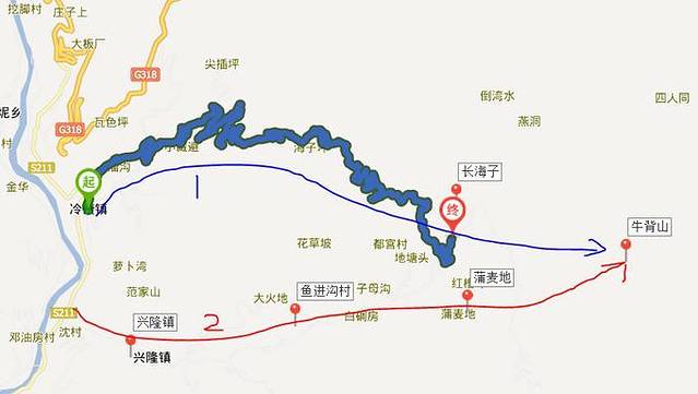 之前提到,上牛背山主要有两个起始点,一个是冷碛镇,一个是三合乡。由于目前很多都是从冷碛上山的,下面主要讲的路线也是从冷碛出发。如图所示,从冷碛上牛背大概有两条路线,蓝线1和红线2(注:这里的线路只是示意图,并非具体路线图)